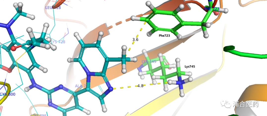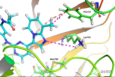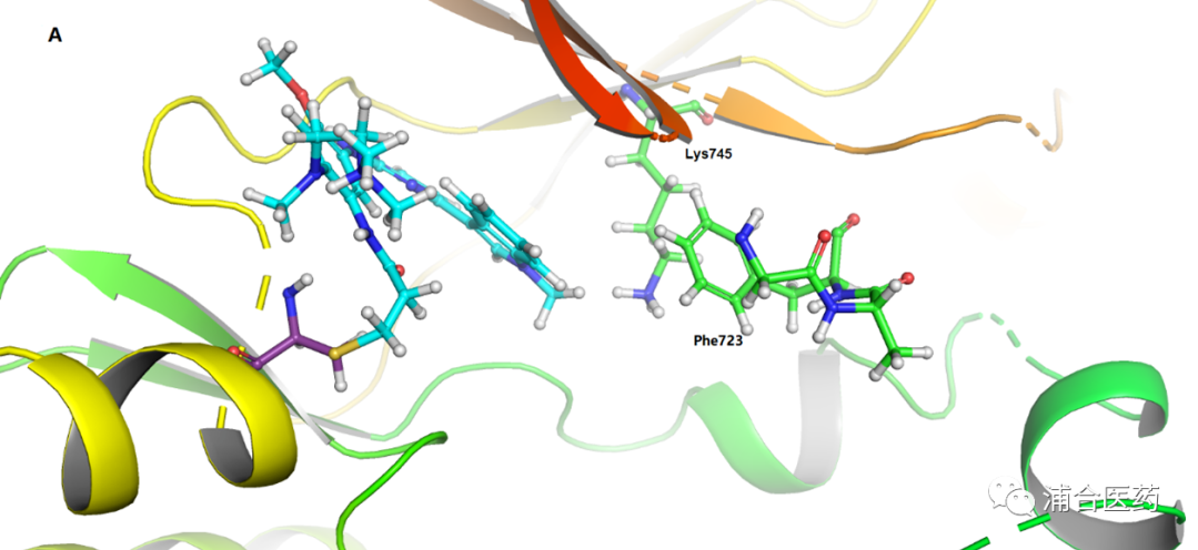 經過多輪的優化篩選,最終找到了候選分子YK-029A。其對于T790M的結合與EGFRex20ins的結合模式類似 (Figure S1),并與設計理念吻合,通過與Phe723的疏水作用 (Figure 3),達到了活性的提高和選擇性的保持。此外,還有一個不穩定(推測可被水分子介導)的和Lys745的氫鍵作用。