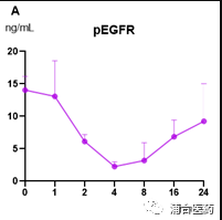 藥效方面,YK-029A不論是在T790M共突變的CDX模型還是20外顯子插入的PDX模型均展現了良好的體內抑制效果 (Figure 5A、5B)。高劑量組均可使得腫瘤消退,并沒有明顯的毒副作用,小鼠體重降低控制在5%以內。此外,在PK-PD模型中,也再次驗證了YK-029A的靶向作用(Figure 6A、6B)。