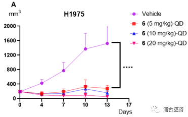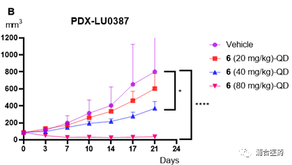 Figure 5A. Antitumor efficacy of compound 6 in the HCC1975 xenograft model of female BALB/c mice (n = 8/group); 5B. Effects of compound 6 in the LU0387 human NSCLC PDX model of BALB/c nude mice (n = 7/group); *p<0.05; **** p<0.0001.