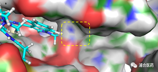 Figure 2A. The X-ray crystal structure of osimertinib bound to the wt-EGFR with 2.31 Å resolution (PDB:6JXT), osimertinib (cyan), Phe723 and Lys745 of EGFR (green); 2B. Surface view (yellow box: hydrophobic pocket near Phe723).